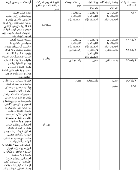 ١- شرکت در انتخابات های جمهوری اسلامی برابر با دادن مشروعیت بینالمللی به رژیم جمهوری اسلامی است و رژیم جمهوری اسلامی باید برچیده شود و حضور اصلاح طلبان در حکومت، موجب افزایش عمر رژیم خواهد شد." جدول زیر بخشی مهم از واقعیت سیاسی امروز ایران، یعنی انتخابات ریاست جمهوری آتی و نتیجهی آن را نشان می دهد که می تواند راه را برای تصمیم گیری به ما نشان دهد.